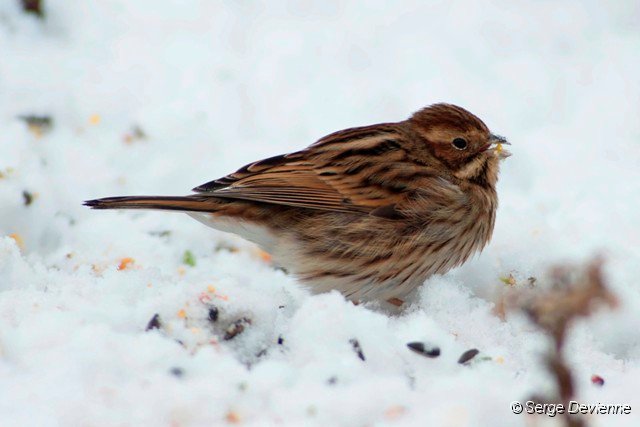 Bruant des roseaux (femelle) sous les mangeoires dans le jardin.